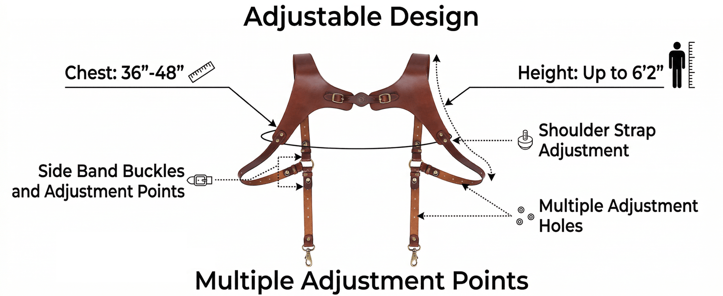 - Adjustable & Comfortable Fit: Featuring multiple adjustment points on the shoulder straps and side bands, our harness suspenders easily customize to your body type, ensuring a secure, comfortable fit all day long without digging in,ensuring a comfortable fit for chest sizes from 36" to 48" and heights up to 6'2".