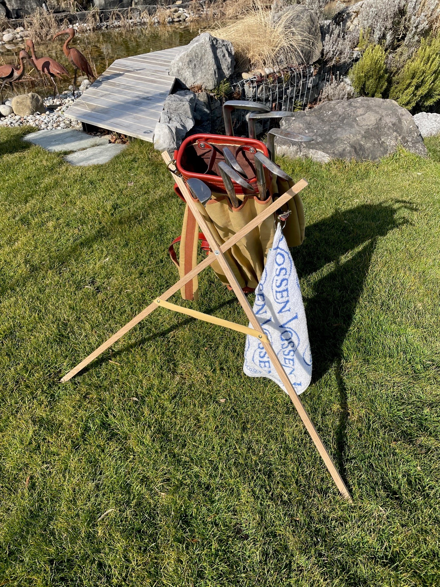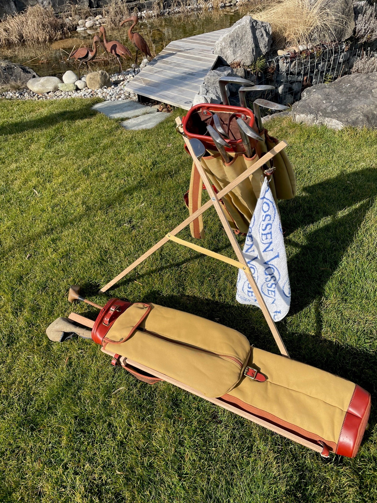 Comments:展开必要にして十分な機能と物入が付いており、競技会でもない限り仲間内でのラウンドには、これに入る本数で十分楽しめる。 帆布独特の風合いと要所要所に本革を施しており、耐久性もありそうだ。 ある程度、ヤレてきても洒落ていて良い雰囲気がでるものと期待する。