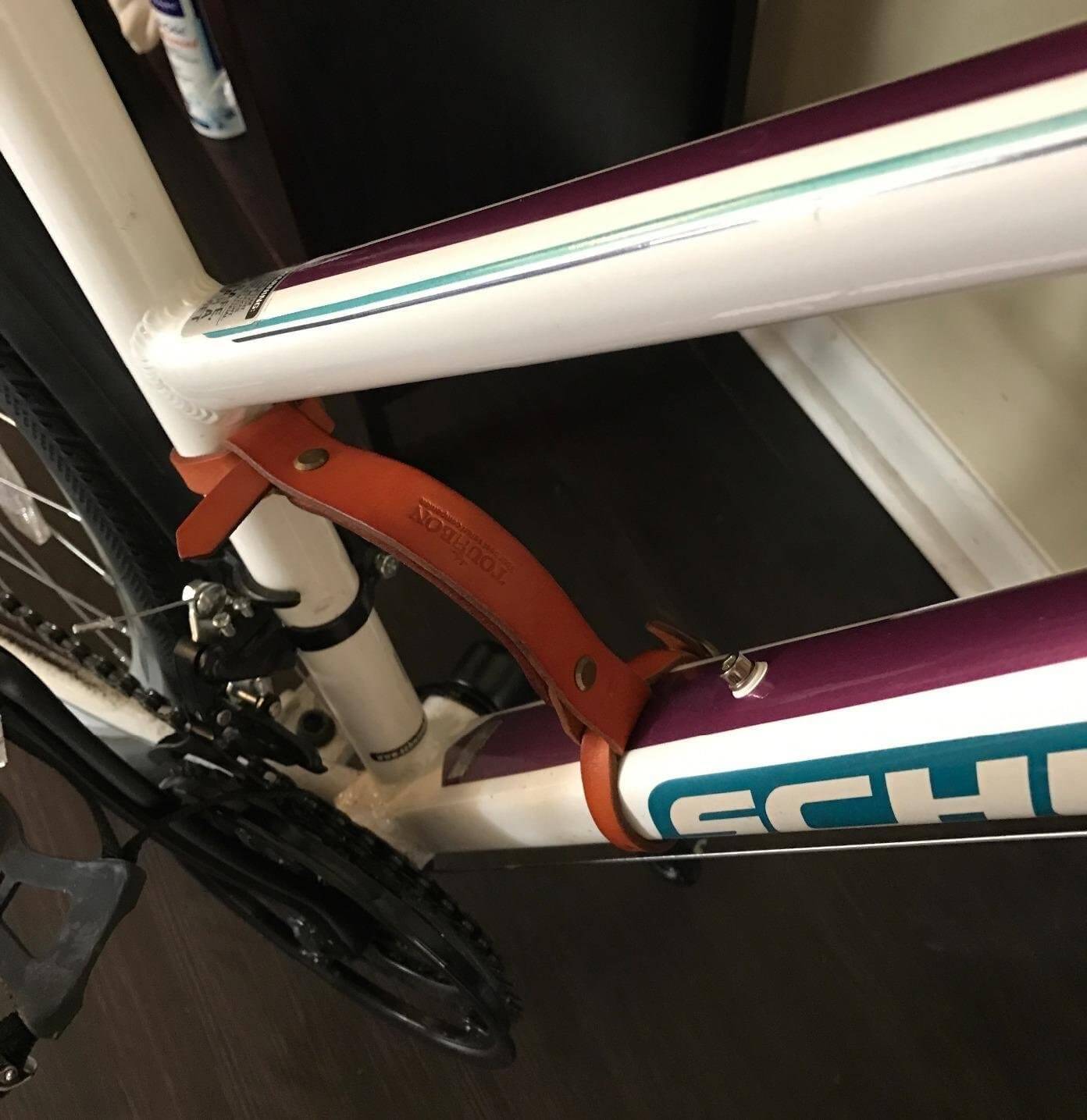 Comments: I found this leather bike carrying strap after shopping Amazon, Etsy and Ebay, for half the price of other straps. It fits my larger aluminum frame tubes very well and works great as a lifting device on my heavier bike. I did have to move my water bottle cage from the seat tube to the down tube and this is something you should check for. It's very well made and looks great. I did wrap the metal rivet heads with silicone tape to make certain they wouldn't mar the frame's finish.