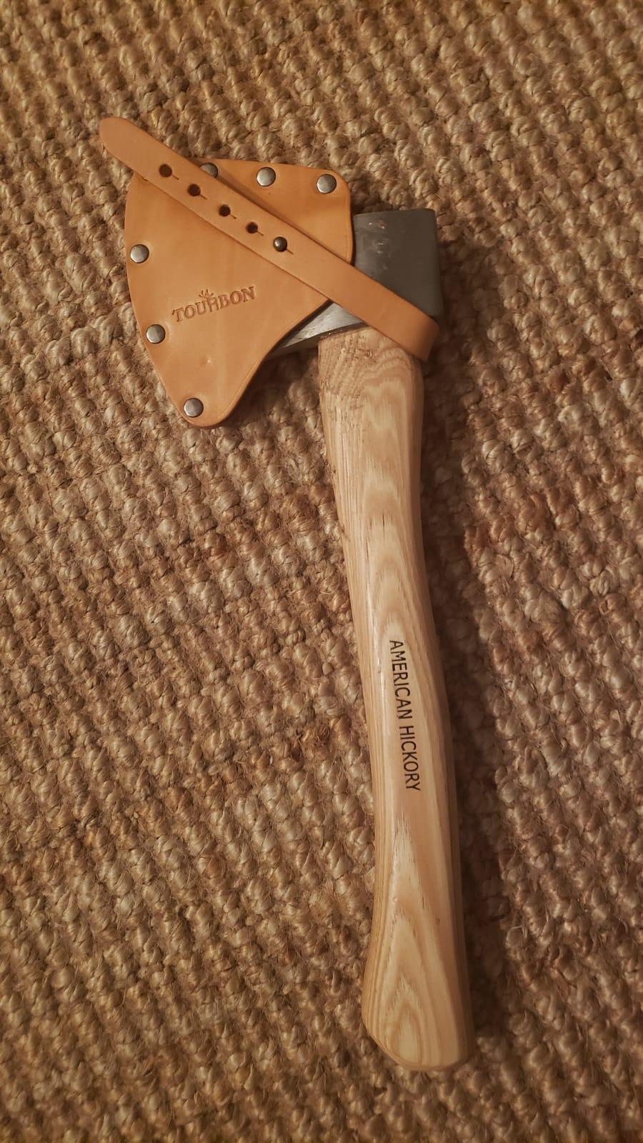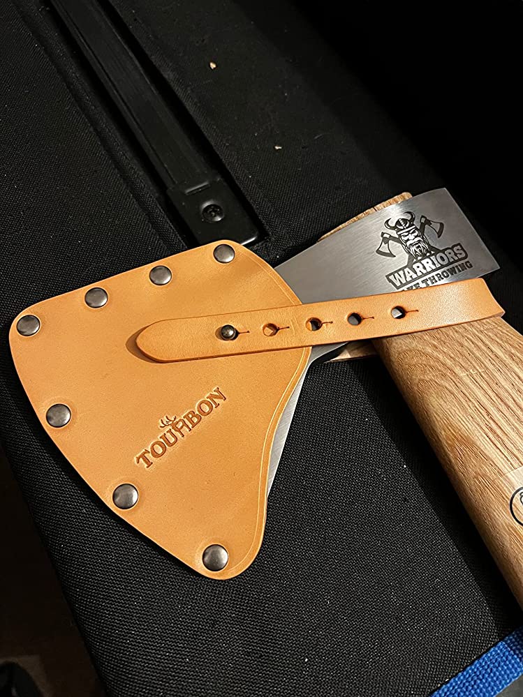 The "TOURBON Small Leather Axe Sheath Hatchet Cover," fits the Harbor Freight Pittsburgh 1-1/4 LBS Hickory Axe. Cheers